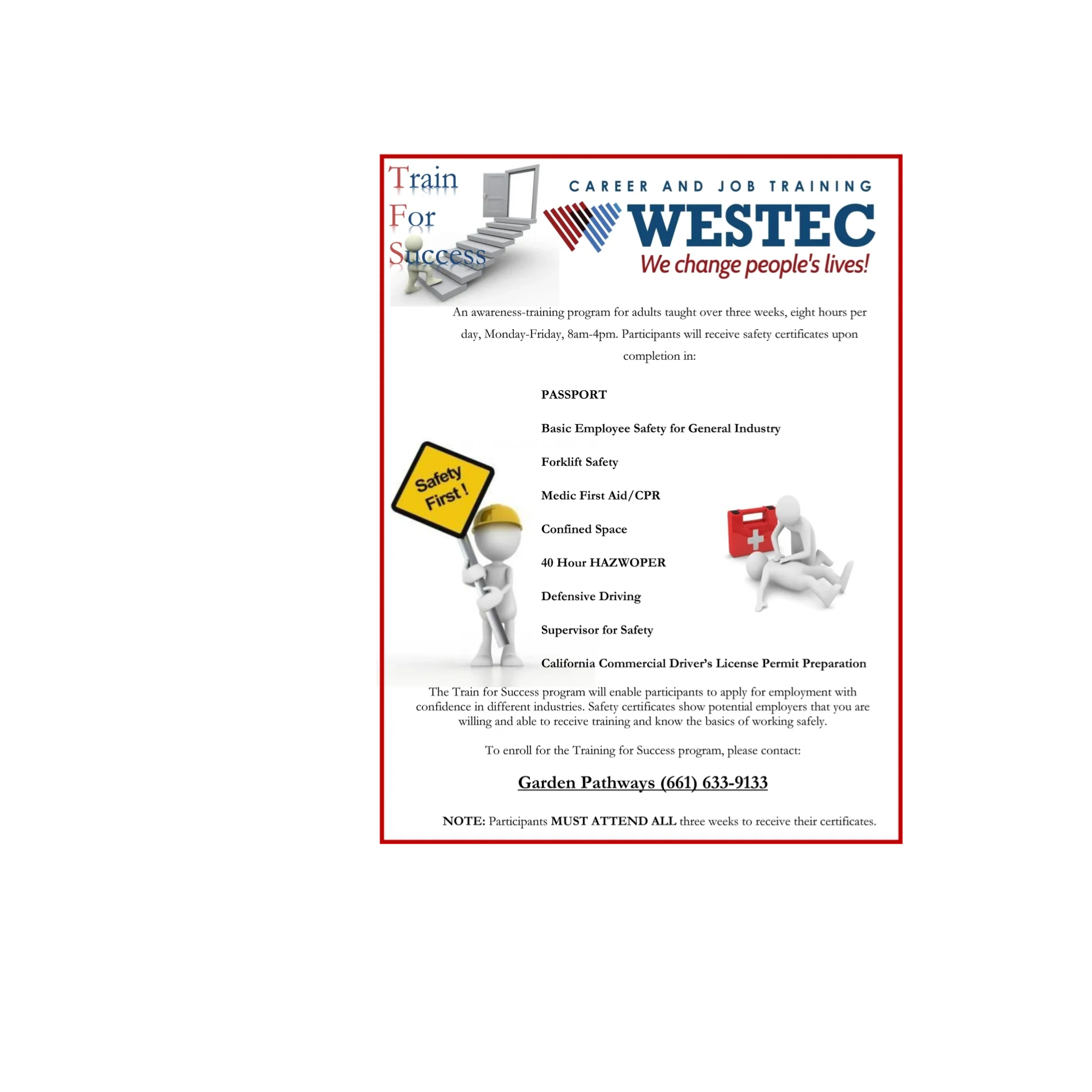 The Train For Success program will earn NINE training certificates after only three weeks of training!  This is your opportunity to build a strong resume for your next job.